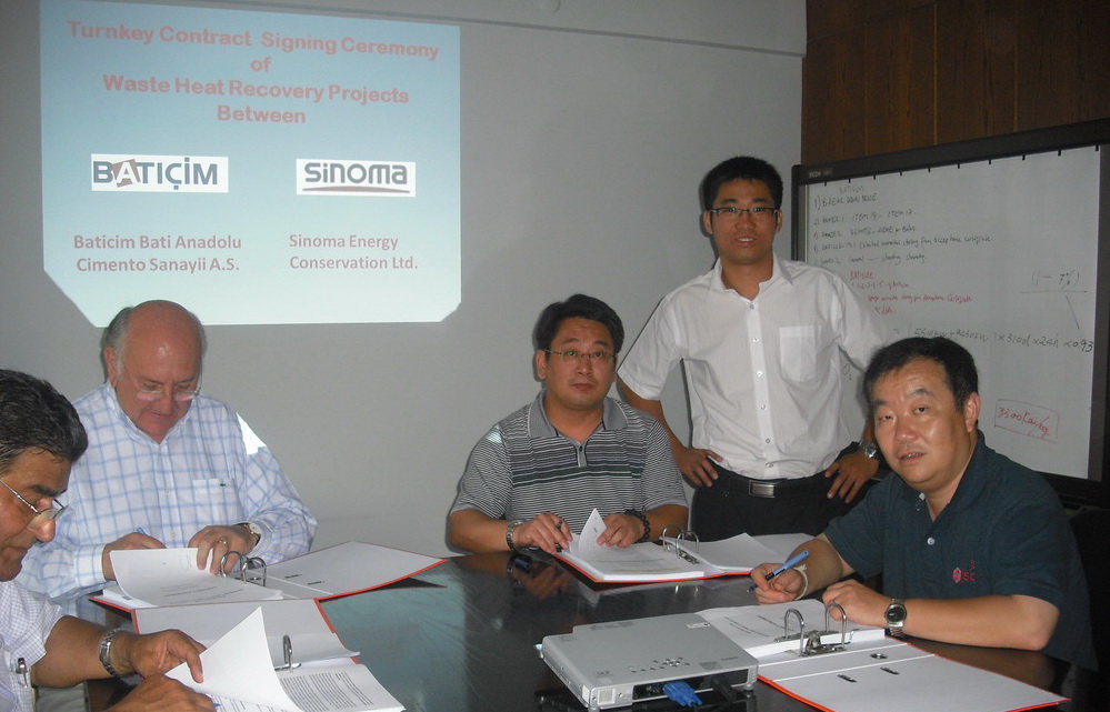 On Aug. 12th, 2010, Sinoma Energy Conservation Ltd. (Sinoma EC) signed two Waste Heat Recovery Power Plant (WHR PP) EPC Contracts with Turkish client named BATICIM Cement Group in Turkey. This is the second time of cooperation with BATICIM cement group since the successful holding of the seminar of waste heat recovery power generation technology by Sinoma EC in Ankara, capital of Turkey this year. The contracts signed are 12MW WHR PP project for Baticim Bati Anadolu Cimento SanayII A.S. and 7MW WHR PP project for Batisoke Soke Cimento SanayII T.A.S both under BATICIM Cement Group.
